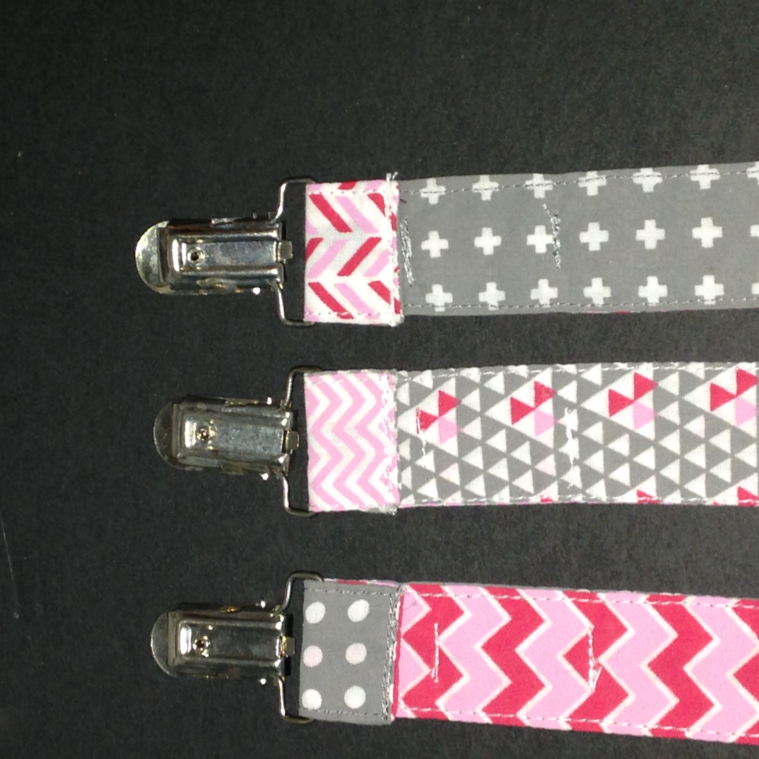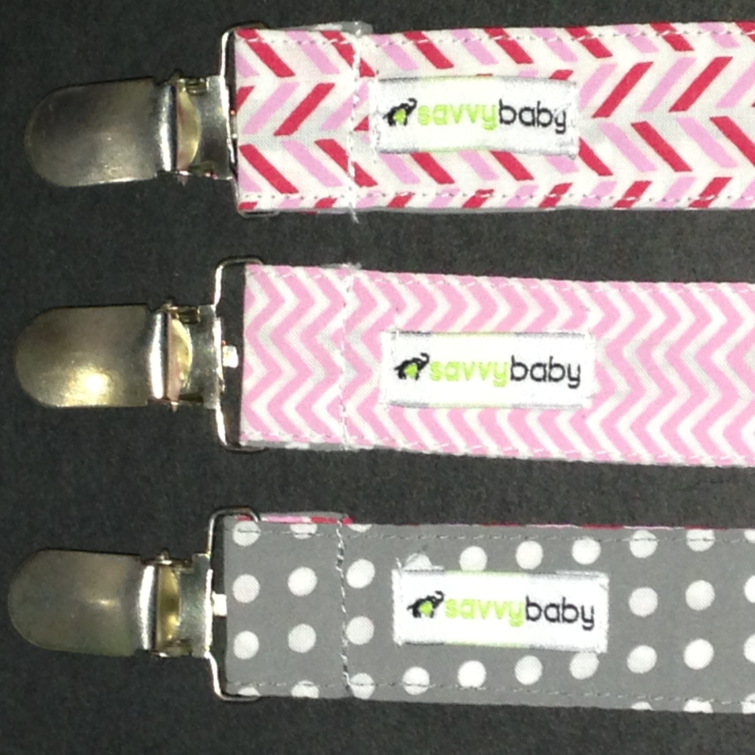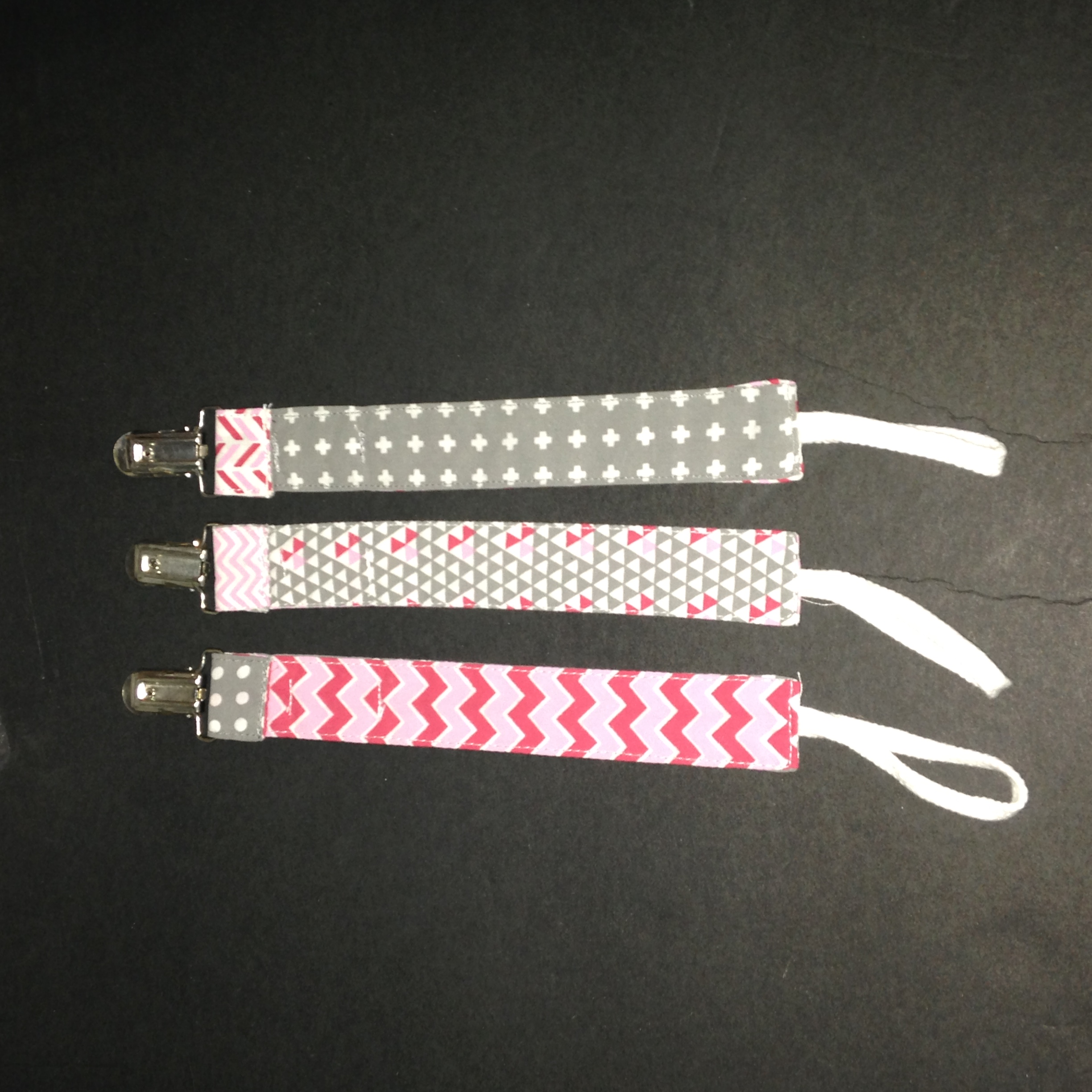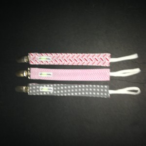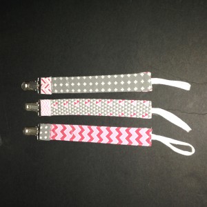3 Pack Pacifier Clips for Girls, Pink & Grey(Sample received for testing in exchange to my honest and unbiased opinion and this opinion is not compensated) The pacifier clips are really colorful with the hoop string on the end for the pacifier and the metal clip to attach to the baby clothing. The clips make it so much easier in keeping up with the pacifier. The colors and patterns are so nice they go with just about anything. The clips are stitched together really well.