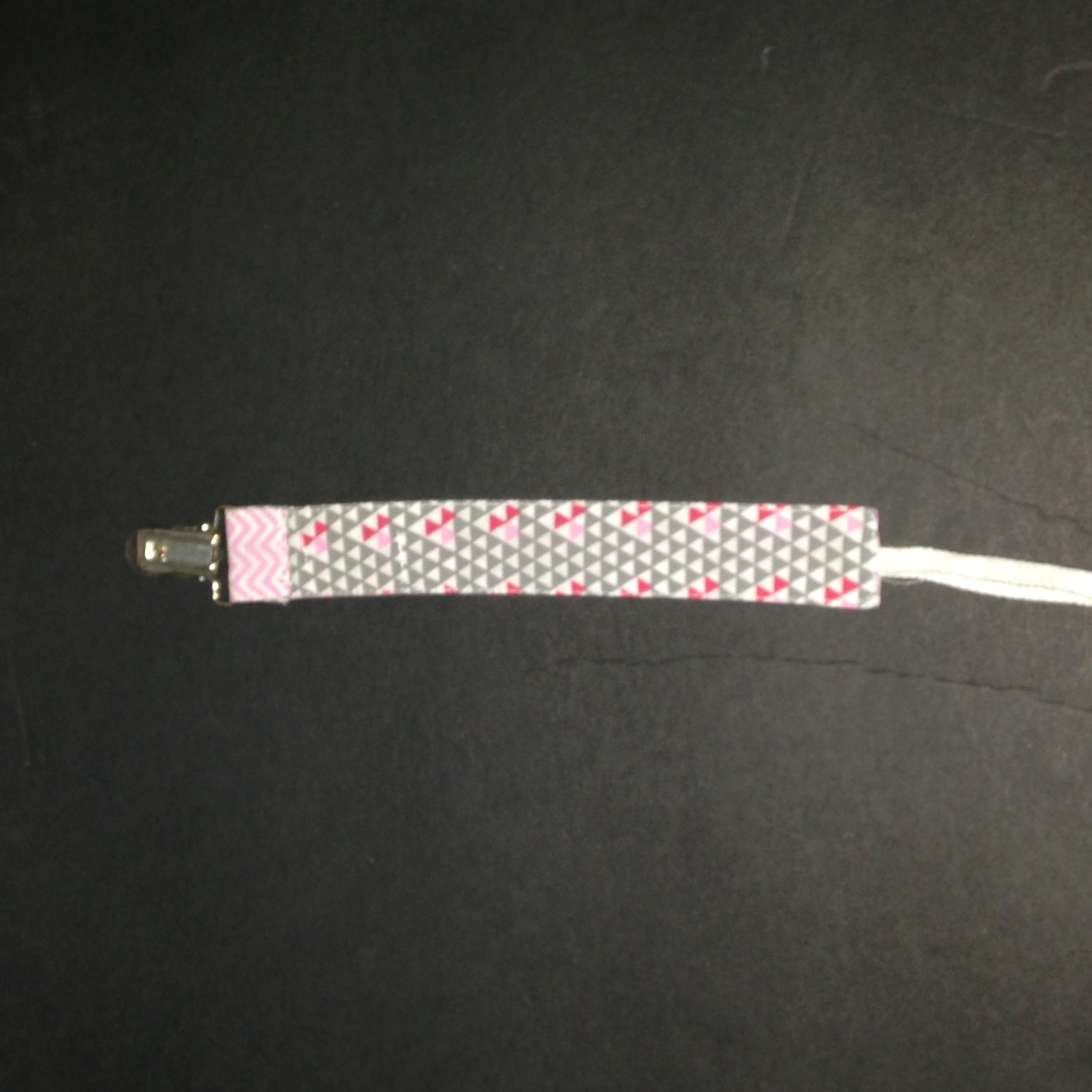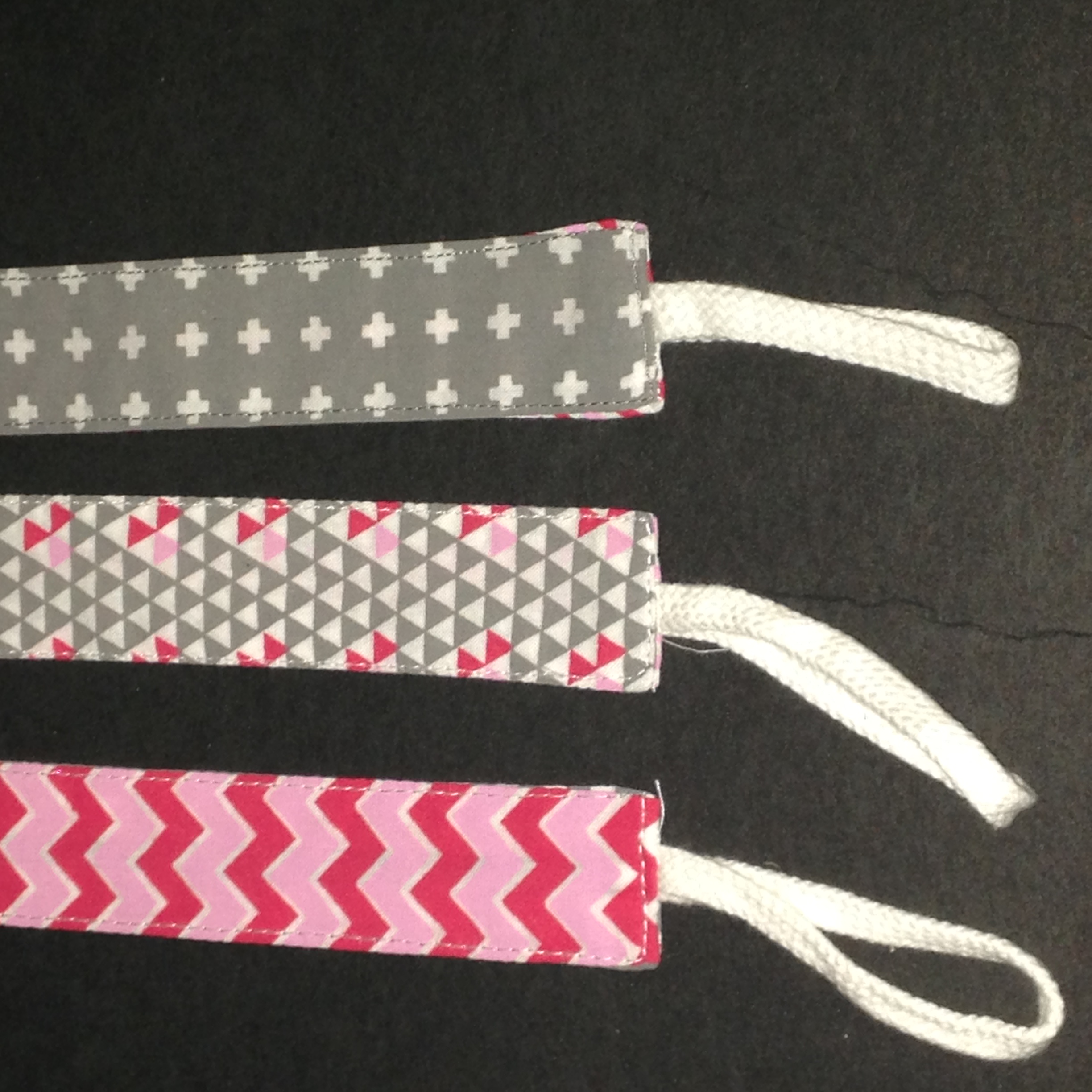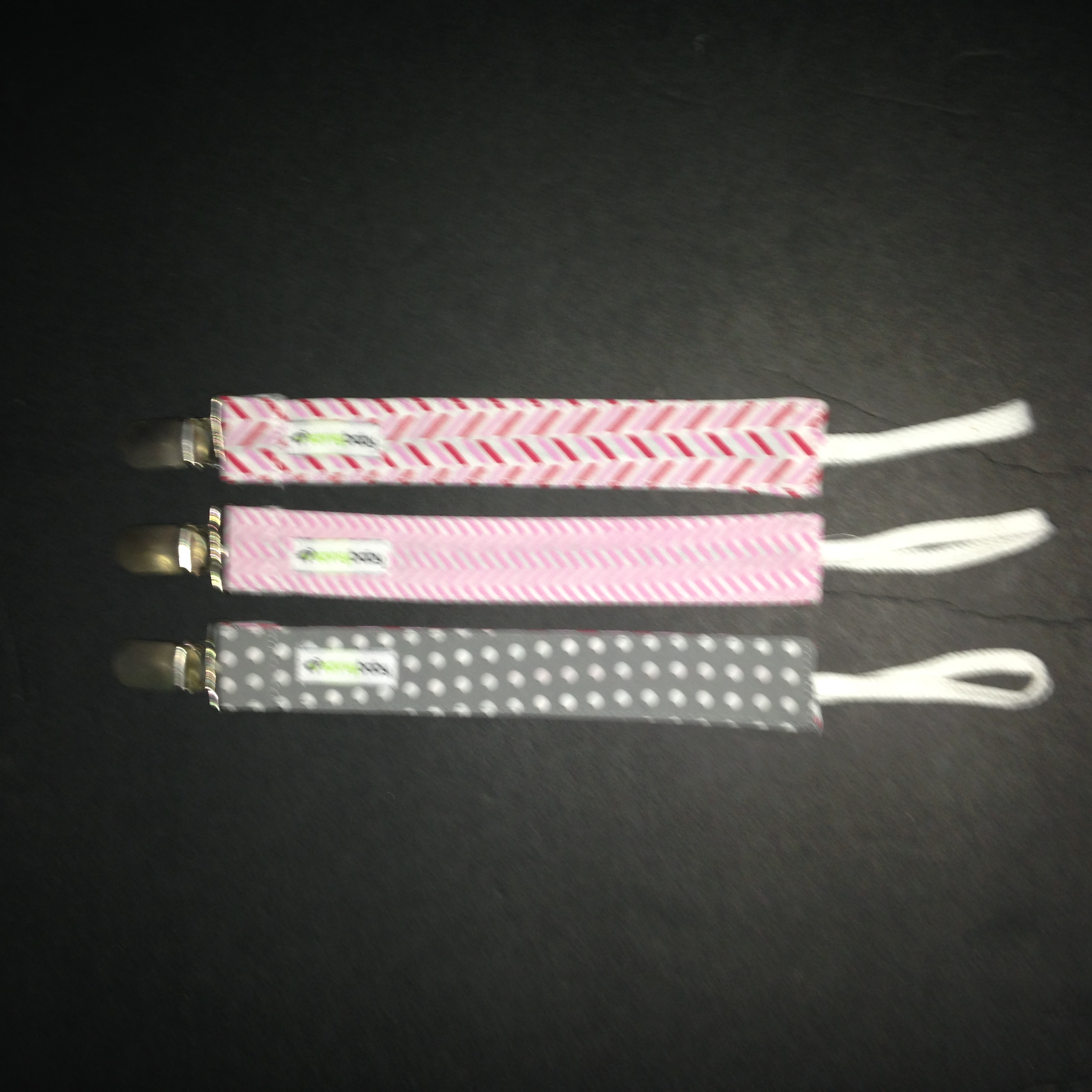 3 Pack Pacifier Clips for Girls, Pink & Grey(Sample received for testing in exchange to my honest and unbiased opinion and this opinion is not compensated) The pacifier clips are really colorful with the hoop string on the end for the pacifier and the metal clip to attach to the baby clothing. The clips make it so much easier in keeping up with the pacifier. The colors and patterns are so nice they go with just about anything. The clips are stitched together really well.