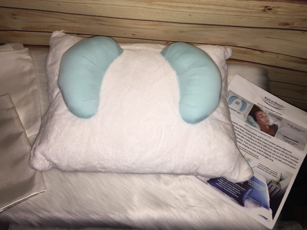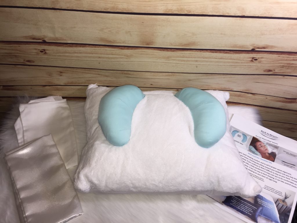 Back To Beauty Anti-Wrinkle Head Cradle Pillow. The pillow aids in proper spinal alignment, for added support, while back sleeping. With this pillow, you can place an extra pillow under the back to beauty pillow for added elevation. You can add a second pillow or more that can be used for additional elevation, and neck support. During the time you use this pillow, you can put side support pillows behind you to keep you from rolling over while you are sleeping. The other thing that helps to keep you from sliding down off the beauty pillow is if you put a support pillow under your knees kinda close to your bottom. Using a pillow under your knees helps to prevent you from sliding down off the pillow.