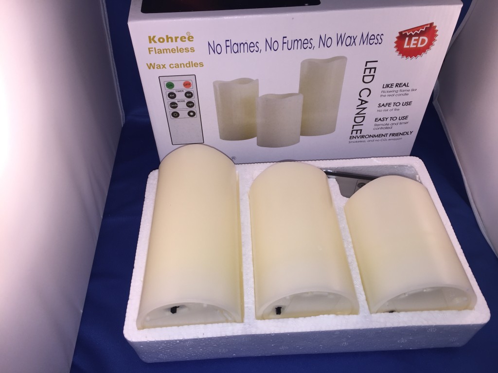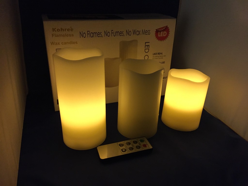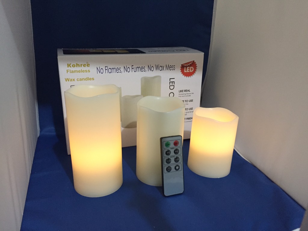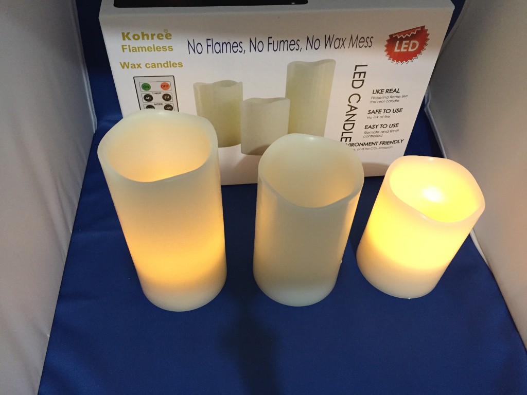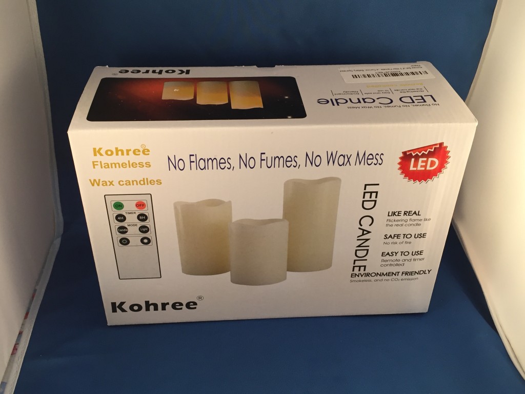 Kohree Set of 3 Melted Edge Flameless Ivory (Sample received for testing in exchange to my honest and unbiased opinion and this opinion is not compensated) The candles are absolutely just pretty to have in my home. I have the candles on my fireplace and I don’t have to worry about a real flame burning and being unsafe for my family. These take 3-AAA batteries in each candle, this also came with a remote control so you can adjust the lighting of the candle, flickering, solid and on/off buttons.