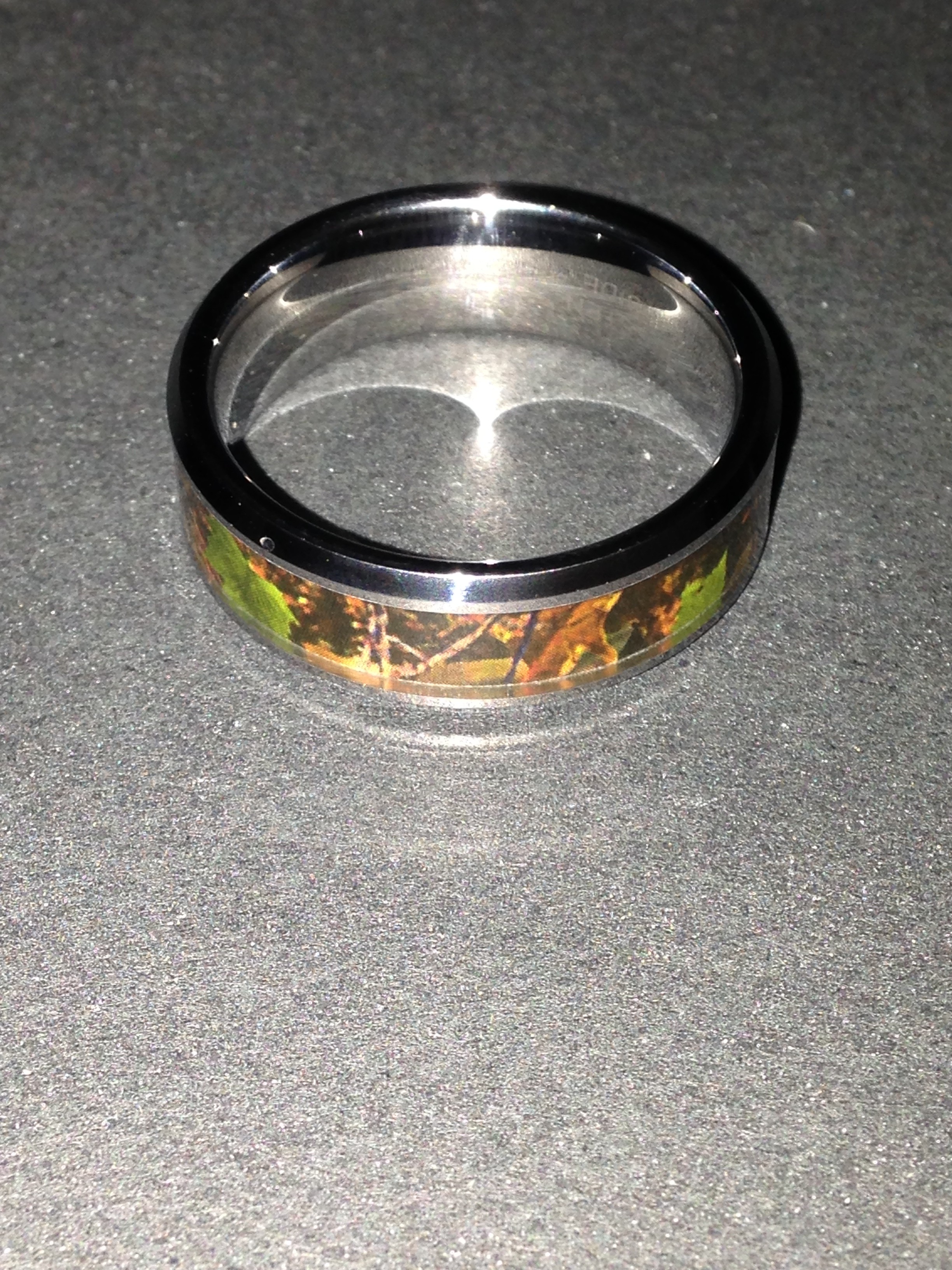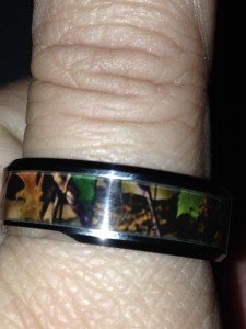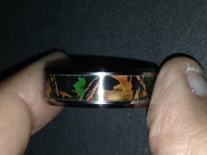 Mens Tungsten Green Hunting Camo Wedding Ring (Sample received for testing in exchange to my honest and unbiased opinion and this opinion is not compensated)The ring is awesome has a great camo greenish look to it. The ring is a size 12 that I ordered for my husband, the weight of the ring is durable and smooth. My husband liked the ring plus this is the style these days.