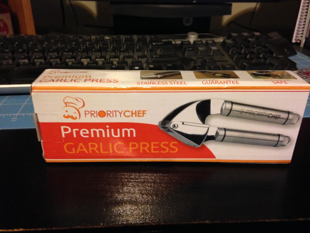 Priority Chef’s Premium Garlic Press. I got this yesterday and used it last night for our garlic and this is made with very good quality not like what you would buy at Wal-Mart. I am truly impressed with the Garlic Press Stainless Steel Mince Garlic. Excellent communication with the company and very fast shipping of the product. I recommend this for everyone A+++++.