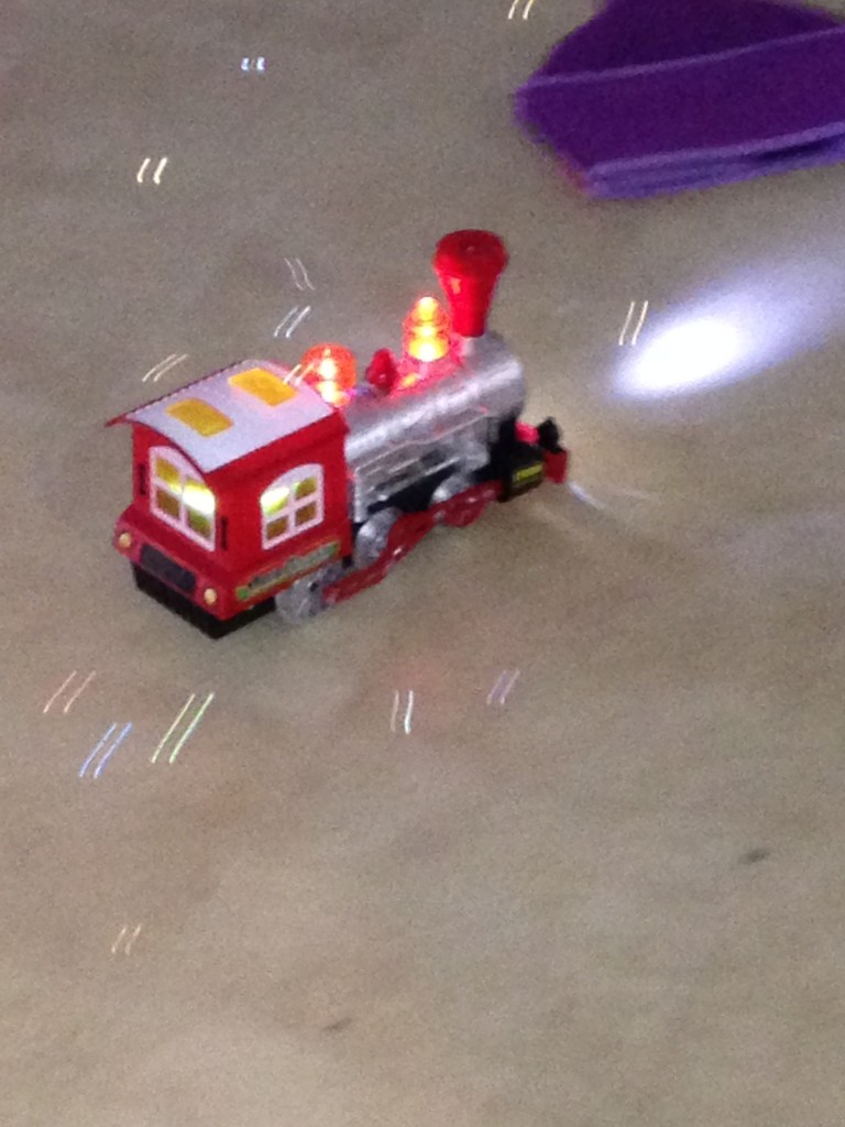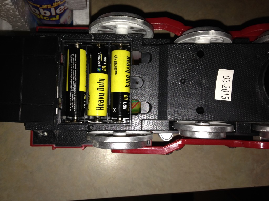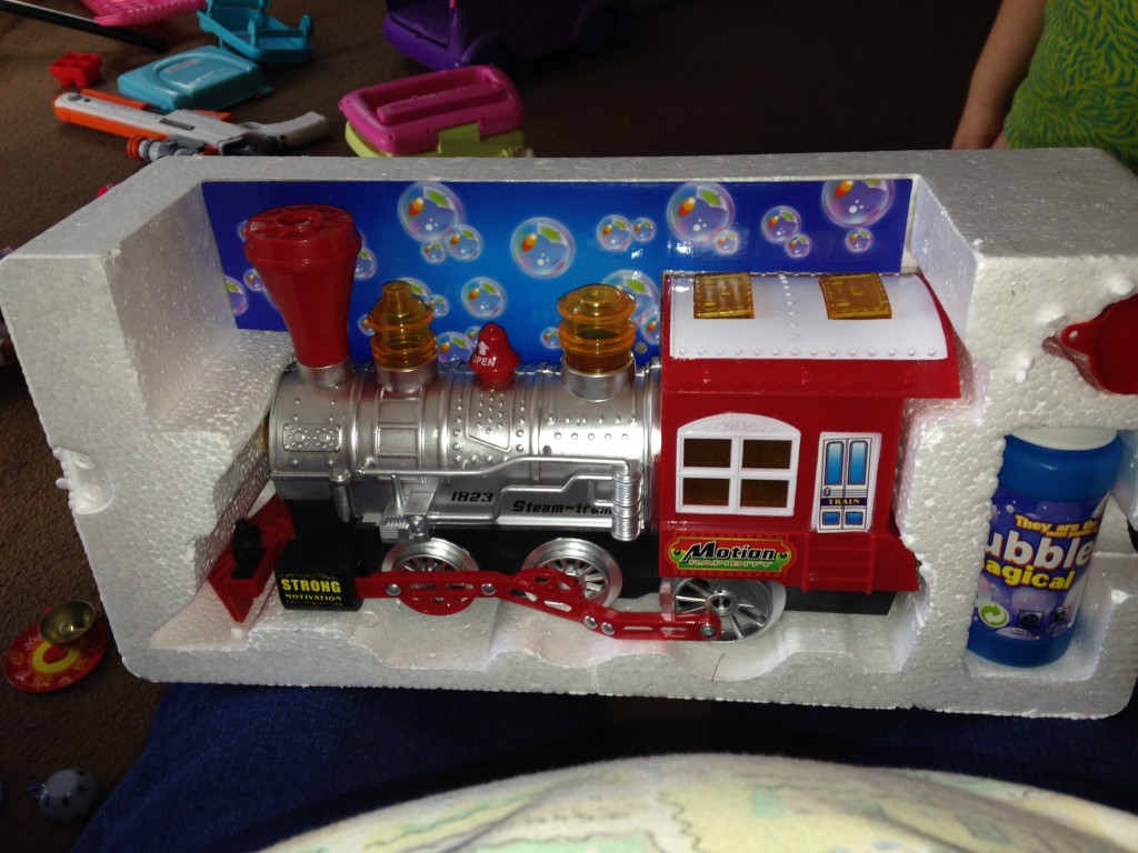 Steam Train Locomotive Engine Car Bubble (Sample received for testing in exchange to my honest and unbiased opinion and this opinion is not compensated)My granddaughter loves this and the bubbles are fast coming out and it plays a tune while it is blowing bubbles, lights up in the front of the train and on top of the train. This takes 3 AAA batteries that aren’t included and for safety reasons there is a screw that keeps that battery door sealed from the little ones. The train came with a small bottle of bubbles and the tiny funnel to pour the bubbles into the train.