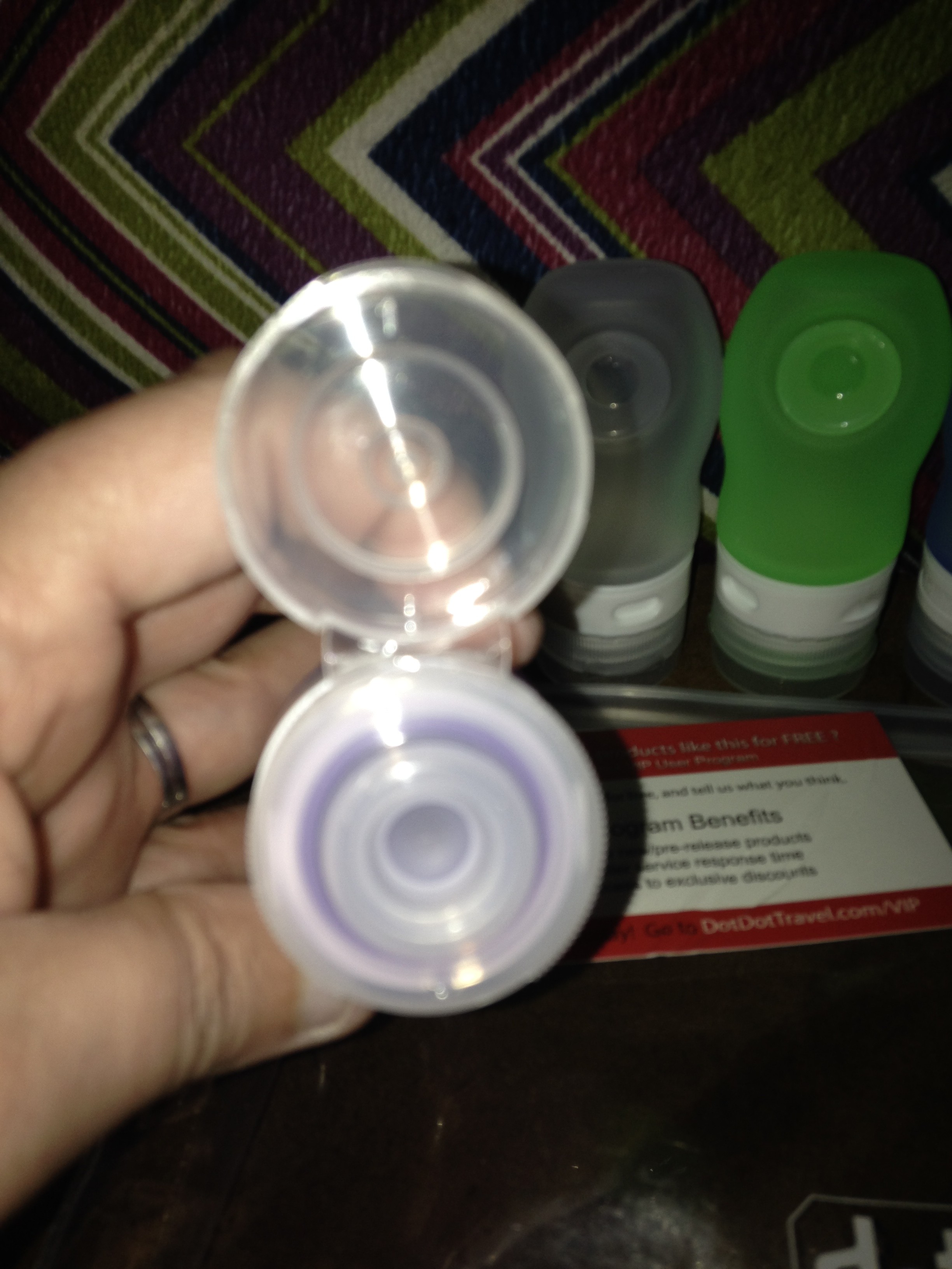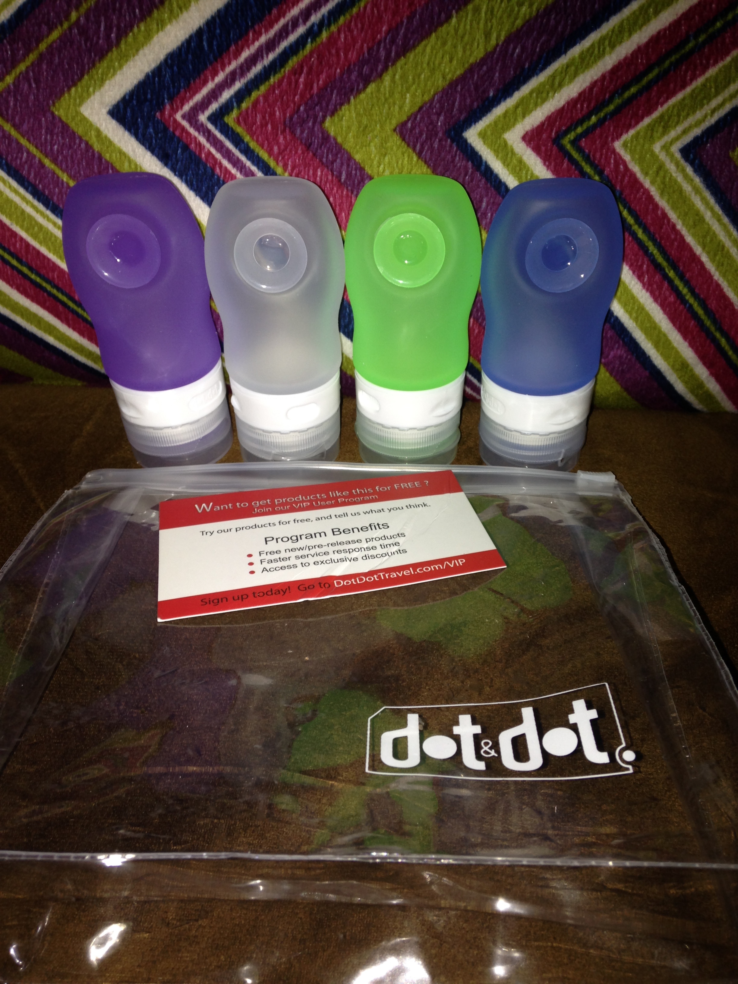 Travel Bottles Set 1.25oz Leak Proof TSA. (I received in exchange for my honest and unbiased review.) I totally love these travel bottles They are so easy to fill liquids in them and seal them shut. They also have a small suction cup on the back which is good to put on the shower wall and not drop it. This also came in a small clear carrying pouch; the colors are vibrant. Awesome communications & product.