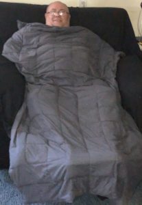 My husband is 5″10 and 380 ponds he uses this blanket nightly & during times when he is napping in his recliner and its helped with his staying in place at night and during naptime. He also uses to move his legs a lot at night and now he doesn’t move then hardly at all. The blanket is a flannel charcoal grey. The quality of the blanket is excellent and there is a lot of craftsmanship that went into making the blanket.